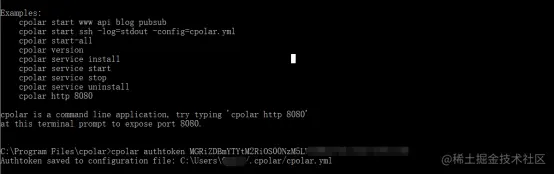 我们只需要点击主界面的蓝色“复制”按钮,然后打开本地的cpolar软件界面,输入“cpolar authtoken (复制的隧道口令)”。输入完毕后,cpolar会给出反馈信息,