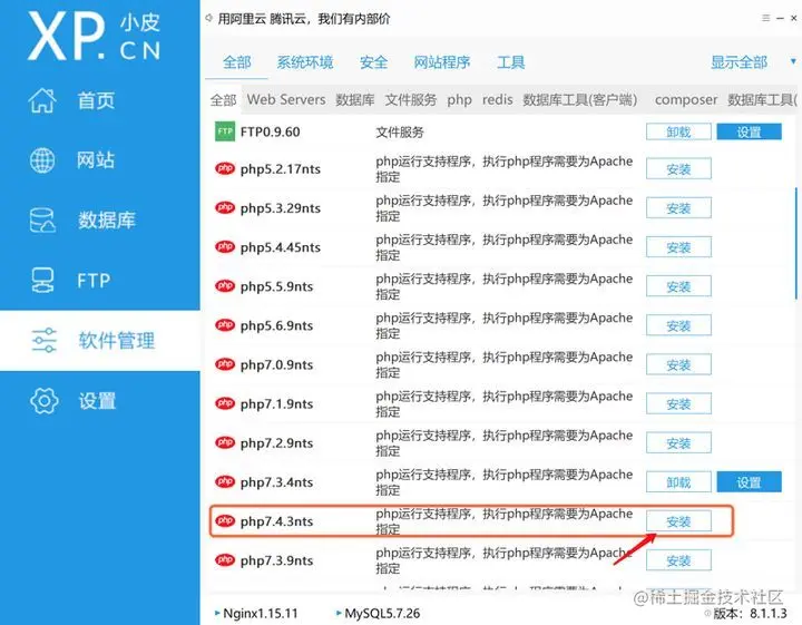 想要正常使用WordPress,需要在本地电脑中安装PHP,因此我们继续使用PHPstudy安装php7.4.3nts,以满足WordPress的运行要求。首先打开PHPstudy的管理面板,在界面左侧选择“软件管理”项,然后再在“软件管理”项显示页内找到“php7.43nts”,点击右侧“安装”按钮。