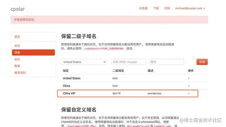 - 二级子域名:dev10(这个名称可选择自己喜欢的,但需要和cpolar设置一致)
