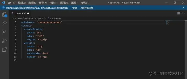 当cpolar的网络后台配置好后,就需要对本地的cpolar.yml文件进行配置,这时我们就要用VS Code软件,打开本地的cpolar.yml文件。并在配置文件的最后添加一个新的隧道。