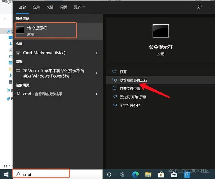 首先,我们需要以管理员身份打开windows命令行窗口,即在“搜索”框内输入命令“cmd”,即打开“命令提示符”模式,然后选择“以管理员身份运行”: