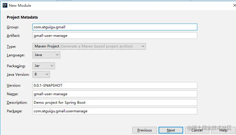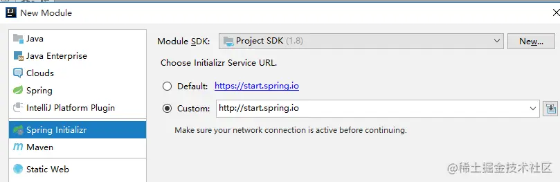 这个时候因为要从网上读取模板所以务必保持联网状态,Spring Initalizr是springboot工程的模板。