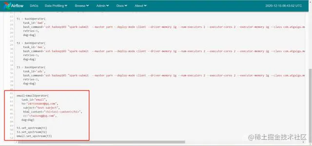 [root@airflow~]# cd /opt/module/work-py/[root@airflowwork-py]# vim test.py #!/usr/bin/pythonfromairflow import DAGfromairflow.operators.bash_operator import BashOperatorfromairflow.operators.email_operator import EmailOperatorfromdatetime import datetime, timedelta default_args= { 'owner': 'test_owner', 'depends_on_past': True, 'email': ['2473196869@qq.com'], 'start_date':datetime(2020,12,15), ' email_on_failure': False, 'email_on_retry': False, 'retries': 1, 'retry_delay': timedelta(minutes=5), # 'queue': 'bash_queue', # 'pool': 'backfill', # 'priority_weight' : 10, # 'end_date': datetime(2016, 1, 1),}dag =DAG('test', default_args=default_args,schedule_interval=timedelta(days=1)) t1 =BashOperator(task_id='dwd', bash_command='ssh hadoop103"spark-submit --master yarn--deploy-mode client --driver-memory 1g --num-executors 2 --executor-cores 2--executor-memory 2g --class com.atguigu.member.controller.DwdMemberController--queue spark /root/work/com_atguigu_warehouse-1.0-SNAPSHOT-jar-with-dependencies.jar"',重试=3, dag=dag) t2 =BashOperator(task_id='dws', bash_command='ssh hadoop103"spark-submit --master yarn--deploy-mode client --driver-memory 1g --num-executors 2 -- executor-cores 2--executor-memory 2g --class com.atguigu.member.controller.DwsMemberController--queue spark /root/work/com_atguigu_warehouse-1.0-SNAPSHOT-jar-with-dependencies.jar"', retries=3 , dag=dag) t3 =BashOperator(task_id='ads',bash_command='ssh hadoop103"spark-submit --master yarn--deploy-mode client --driver-memory 1g --num-executors 2 --executor-cores 2--executor-memory 2g --class com.atguigu。 member.controller.AdsMemberController--队列火花 /root/work/com_atguigu_warehouse-1.0-SNAPSHOT-jar-with-dependencies.jar"', retries=3,dag=dag) email=EmailOperator( task_id="email", to= "2473196869@qq.com", subject="test-subject", html_content="<h1>test-content</h1>", cc="chaosong@qq.com", dag=dag) t2.set_upstream(t1 )t3.set_upstream(t2)email.set_upstream(t3) (python3)[root@airflow work-py]# cp test.py ~/airflow/dags/spark-submit --master yarn--deploy-mode client --driver-memory 1g --num-executors 2 --executor-cores 2--executor-memory 2g --class com.atguigu.member.controller.AdsMemberController- -queue spark /root/work/com_atguigu_warehouse-1.0-SNAPSHOT-jar-with-dependencies.jar"', retries=3,dag=dag) email=EmailOperator( task_id="email", to="2473196869@qq.com ", subject="test-subject", html_content="<h1>test-content</h1>", cc="chaosong@qq.com", dag=dag) t2.set_upstream(t1)t3.set_upstream(t2 )email.set_upstream(t3) (python3)[root@airflow work-py]# cp test.py ~/airflow/dags/spark-submit --master yarn--deploy-mode client --driver-memory 1g --num-executors 2 --executor-cores 2--executor-memory 2g --class com.atguigu.member.controller.AdsMemberController- -queue spark /root/work/com_atguigu_warehouse-1.0-SNAPSHOT-jar-with-dependencies.jar"', retries=3,dag=dag) email=EmailOperator( task_id="email", to="2473196869@qq.com ", subject="test-subject", html_content="<h1>test-content</h1>", cc="chaosong@qq.com", dag=dag) t2.set_upstream(t1)t3.set_upstream(t2 )email.set_upstream(t3) (python3)[root@airflow work-py]# cp test.py ~/airflow/dags/dag=dag) email=EmailOperator( task_id="email", to="2473196869@qq.com", subject="test-subject", html_content="<h1>test-content</h1>", cc=" chaosong@qq.com", dag=dag) t2.set_upstream(t1)t3.set_upstream(t2)email.set_upstream(t3) (python3)[root@airflow work-py]# cp test.py ~/airflow/dags /dag=dag) email=EmailOperator( task_id="email", to="2473196869@qq.com", subject="test-subject", html_content="<h1>test-content</h1>", cc=" chaosong@qq.com", dag=dag) t2.set_upstream(t1)t3.set_upstream(t2)email.set_upstream(t3) (python3)[root@airflow work-py]# cp test.py ~/airflow/dags /