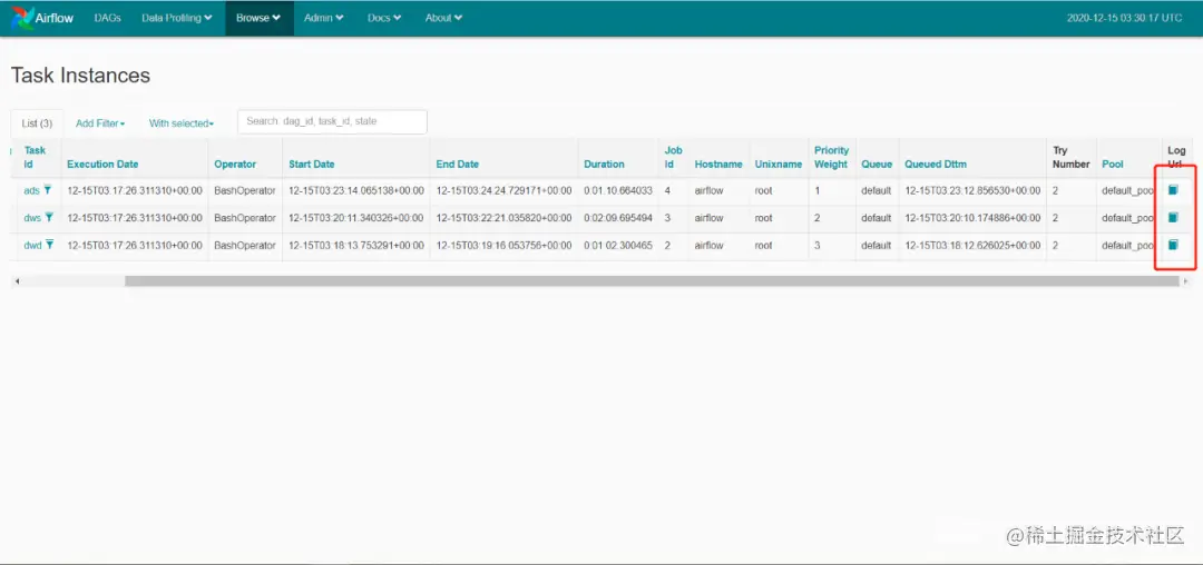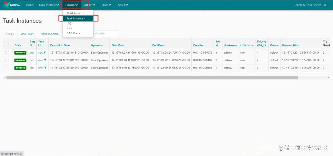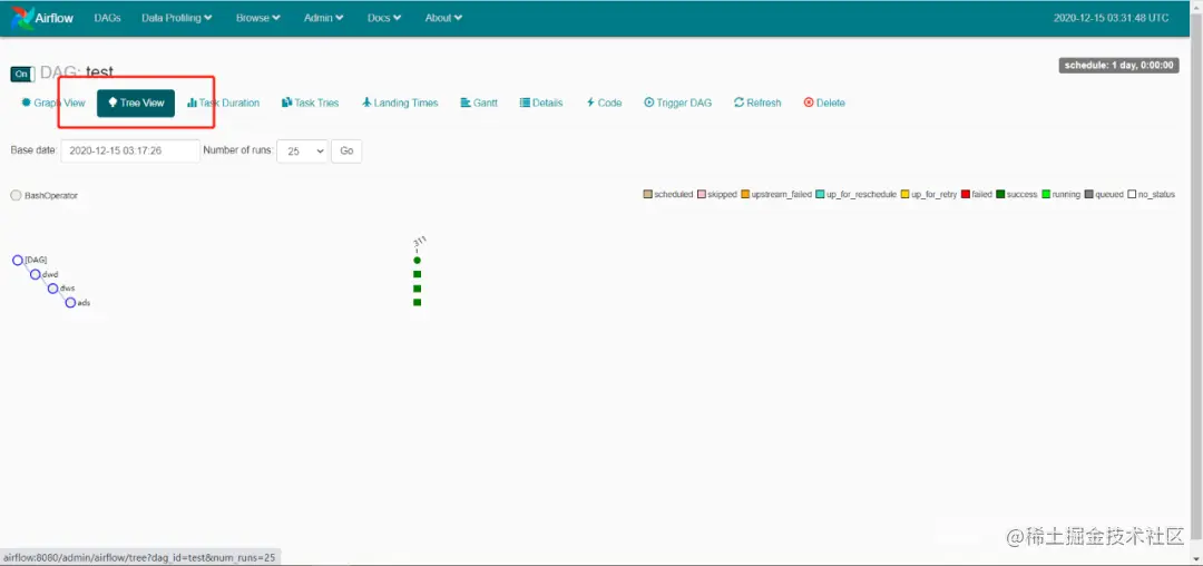(python3)[root@airflow work-py]# airflow list_tasks test --treeThe'list_tasks' 命令在 Airflow 2.0 中已弃用并删除,请改用'tasks list' [2020-12-1511:17:08,981] {__init__ .py:50} INFO - 使用执行器 SequentialExecutor[2020-12-1511:17:08,982] {dagbag.py:417} INFO - 从 /root/airflow/dags<Task(BashOperator):dwd> 填充 DagBag任务(BashOperator):dws> <任务(BashOperator):广告>