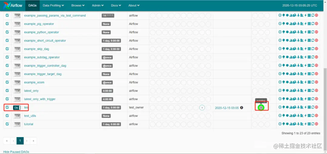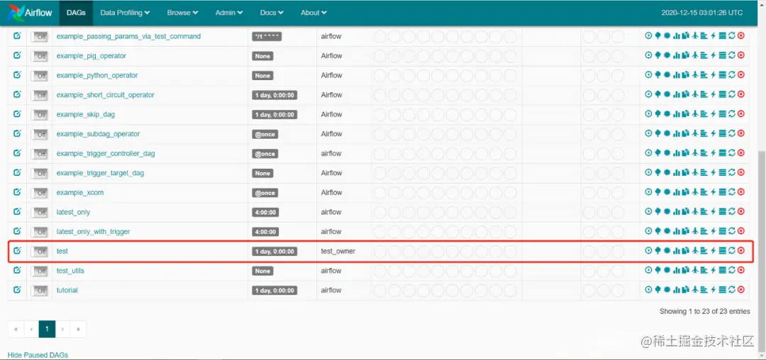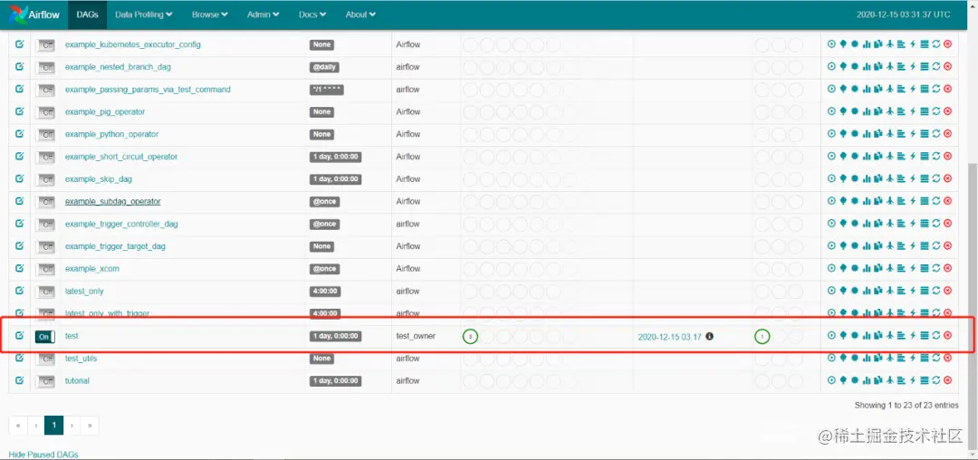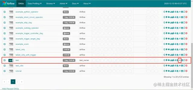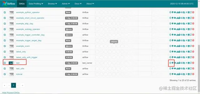 8.刷新Airflow的网页页面,已经出现测试任务。