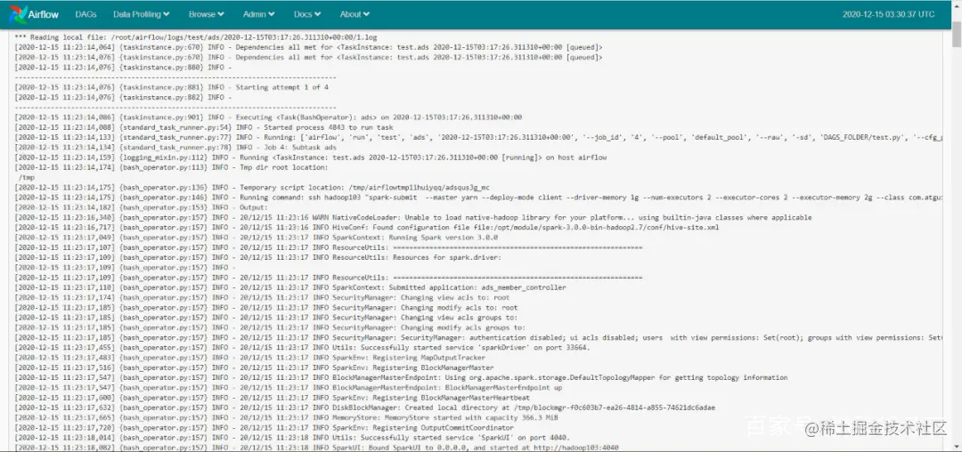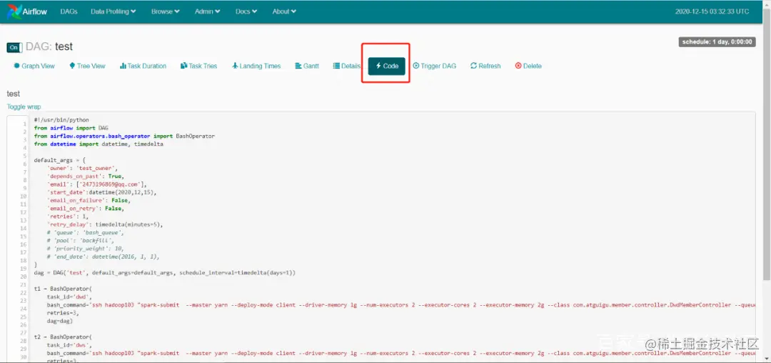 [root@airflow~]# mkdir -p /opt/module/work-py[root@airflow~]# cd /opt/module/work-py/[root@airflowwork-py]# vim test.py #!/ usr/bin/pythonfromairflow import DAGfromairflow.operators.bash_operator import BashOperatorfromdatetime import datetime, timedelta default_args= { 'owner': 'test_owner', 'depends_on_past': True, 'email': ['2473196869@qq.com'], 'start_date ':datetime(2020,12,15), 'email_on_failure': False, 'email_on_retry': False, 'retries': 1, 'retry_delay': timedelta(minutes=5), # 'queue': 'bash_queue', # 'pool': 'backfill', # 'priority_weight': 10, # 'end_date': datetime(2016, 1, 1),}dag =DAG('test', default_args=default_args,schedule_interval=timedelta(days=1)) t1 =BashOperator(task_id='dwd', bash_command='ssh hadoop103"spark-submit --master yarn--deploy-mode client --driver-memory 1g --num-executors 2 --executor-cores 2--executor-memory 2g --class com.atguigu.member.controller.DwdMemberController--queue spark /root/work/com_atguigu_warehouse-1.0-SNAPSHOT-jar-with-dependencies.jar"',重试=3, dag=dag) t2 =BashOperator(task_id='dws', bash_command='ssh hadoop103"spark-submit --master yarn--deploy-mode client --driver-memory 1g --num-executors 2 -- executor-cores 2--executor-memory 2g --class com.atguigu.member.controller.DwsMemberController--queue spark /root/work/com_atguigu_warehouse-1.0-SNAPSHOT-jar-with-dependencies.jar"', retries=3 , dag=dag) t3 =BashOperator(task_id='ads',bash_command='ssh hadoop103"spark-submit --master yarn--deploy-mode client --driver-memory 1g --num-executors 2 --executor-cores 2--executor-memory 2g --class com.atguigu。 member.controller.AdsMemberController--队列火花 /root/work/com_atguigu_warehouse-1.0-SNAPSHOT-jar-with-dependencies.jar"', retries=3, dag=dag) t2.set_upstream(t1)t3.set_upstream(t2)