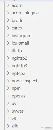 Node.js 源码仓库的 /deps 目录下有十几个依赖,其中既有 C 语言编写的模块(如 libuv、V8)也有JavaScript 语言编写的模块(如 acorn、acorn-plugins),如下图所示。