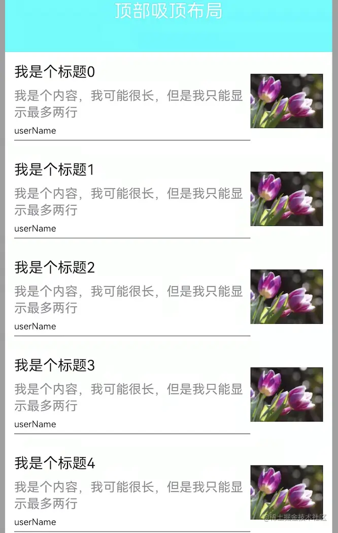 上述60行代码中的Ui,包含了一个纵向滚动的list布局,item有文本有图片,有点击事件,还有顶部吸顶效果。没有xml没有adapter,相比xml-view体系,代码简洁度确实高了不少。