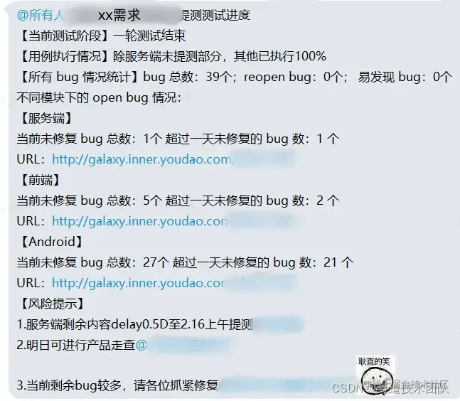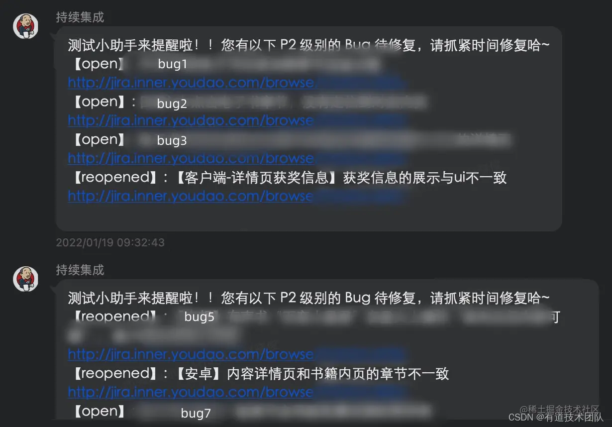 自动提醒开发QAfix和验收bug:—— 精准找到需要处理bug,处理效率大大提升 项目流程复盘中,我们约定p1bug当天需要fix,p2bug原则上fix周期不超过T+1天,验收不超过T+2天。如下图,就是根据形成的规范自动提醒研发、测试的内容: