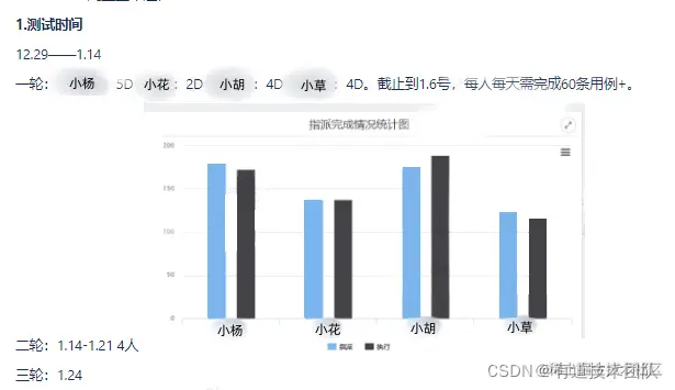 如下图,测试计划的拆解与人员分配,细致划分到每人每日的工作目标,且各模块的分配会进行交叉,一轮测试人员发现用例不完善或测试不方便的地方也即使提供了文档以便二轮人员尽快上手测试。
