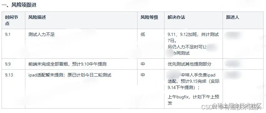 【how】遇到风险点时怎么做:测试阶段,除了QA环节的风险点需要及时暴露和push外,这个阶段研发和产品也在做一些工作。在项目流程管理中,作为最下游的参与者,需要关注这些风险点,及时暴露和push解决。