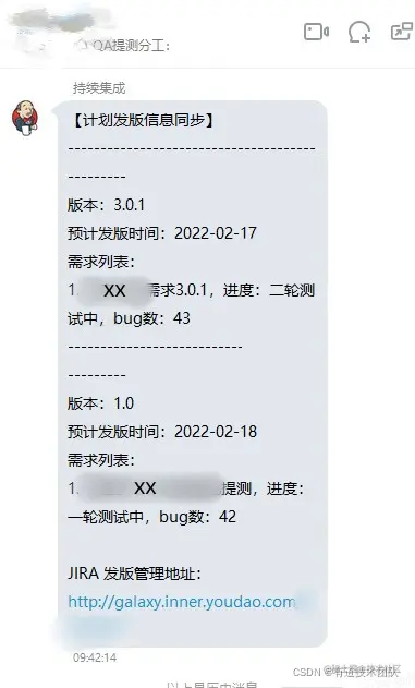 - 项目进度自动同步:如下,项目组成员能很清晰的知道当前项目进度,且版本进度每天都会自动在大群同步;完结的项目,也会根据项目情况自动同步复盘信息