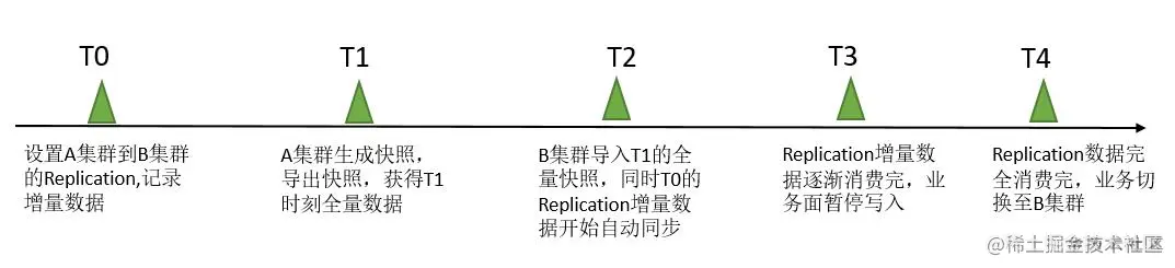 T1: 生成该时间点的全量数据,通过创建快照,以及导出快照数据的方式将该时间点的数据导出到新集群B;