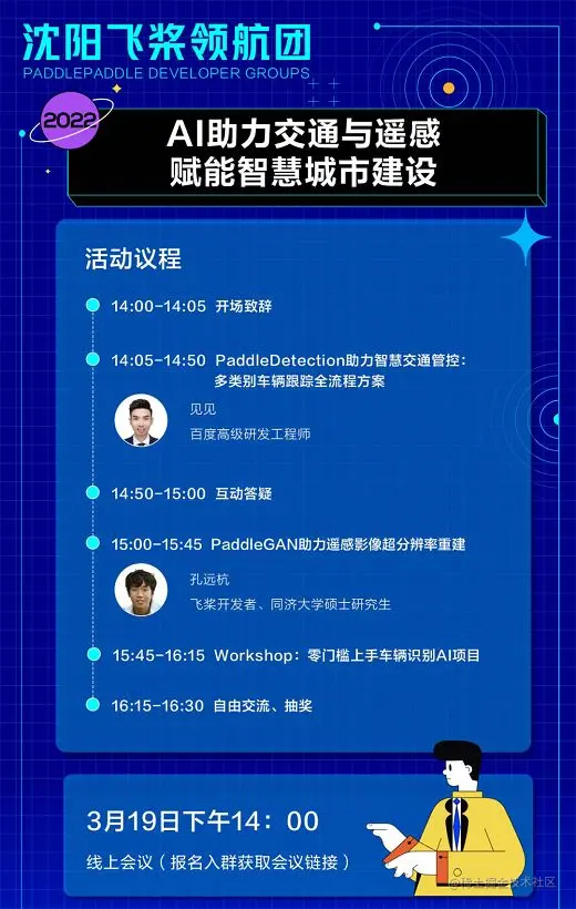 3月19日,沈阳飞桨领航团将举办线上开发者Meetup,邀请百度高级研发工程师和飞桨开发者一起探讨飞桨在交通管理和城市卫星遥感影像中的应用。