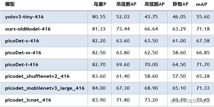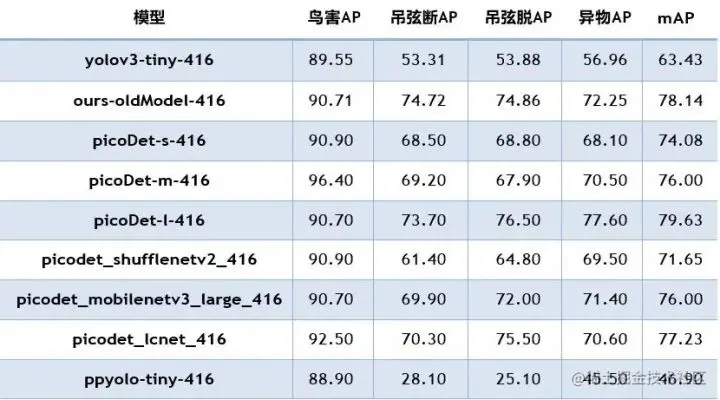 项目选用picodet_lcnet_416模型,指标较原有自定义模型提升2%,推理速度加速53%,为进⼀步业务算法实施提供了可能性。