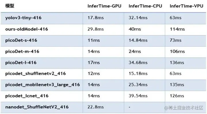 IR模型转换参考: ConvertaPaddlePaddleModeltoONNXandOpenVINOIRdocs.openvino.ai/latest/note…2. 数据后处理参考:PicoDetPostProcessgithub.com/PaddlePaddl…3. 推理时间如下表所示。GPU:Intel HD Graphics 530CPU:Intel(R) Core(TM) i7-6700 CPU @3.40GHz 3.41GHzVPU:Movidius MyriadX
