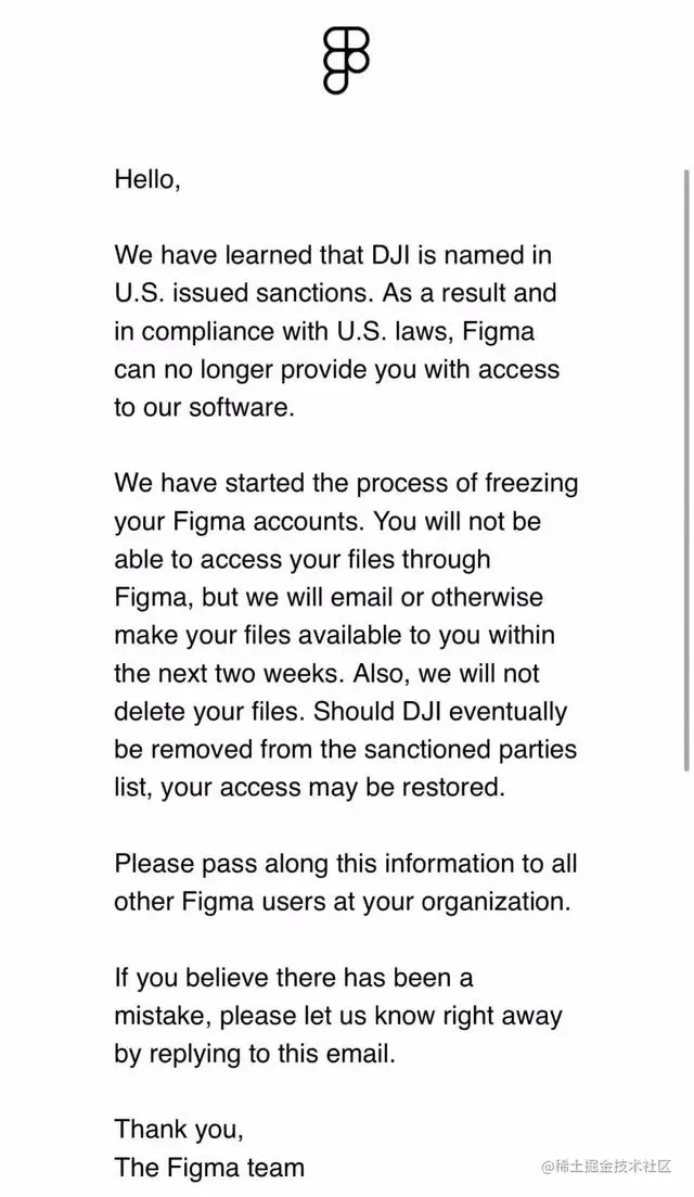 “我们了解到,大疆在美国制裁名单中被点名。因此根据美国法律,Figma 无法再为您提供对我们软件的访问权限,我们已经开始冻结您的 Figma 账户。我们将在未来两周内通过电子邮件或其他方式将您的文件提供给您。此外,我们不会删除您的文件。如果大疆最终从受制裁方列表中删除,您的访问权限可能会恢复。”