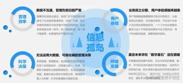 目前,校园数字化信息资源整合是智慧校园建设的最大问题及挑战,大多数高校的信息和数据分散;各个系统之间存在着信息孤岛、信息壁垒;功能上不能互通等问题,难以实现信息资源共享与有效利用。