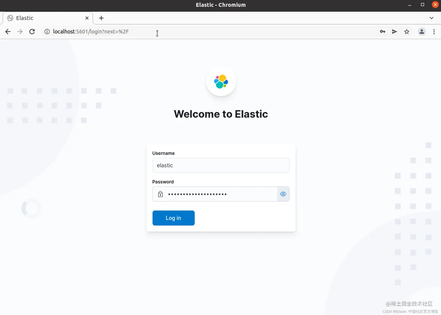 填入 elastic 超级用户的密码。这个是在之前启动 Elasticsearch 时可以看到的。点击 Log in:
