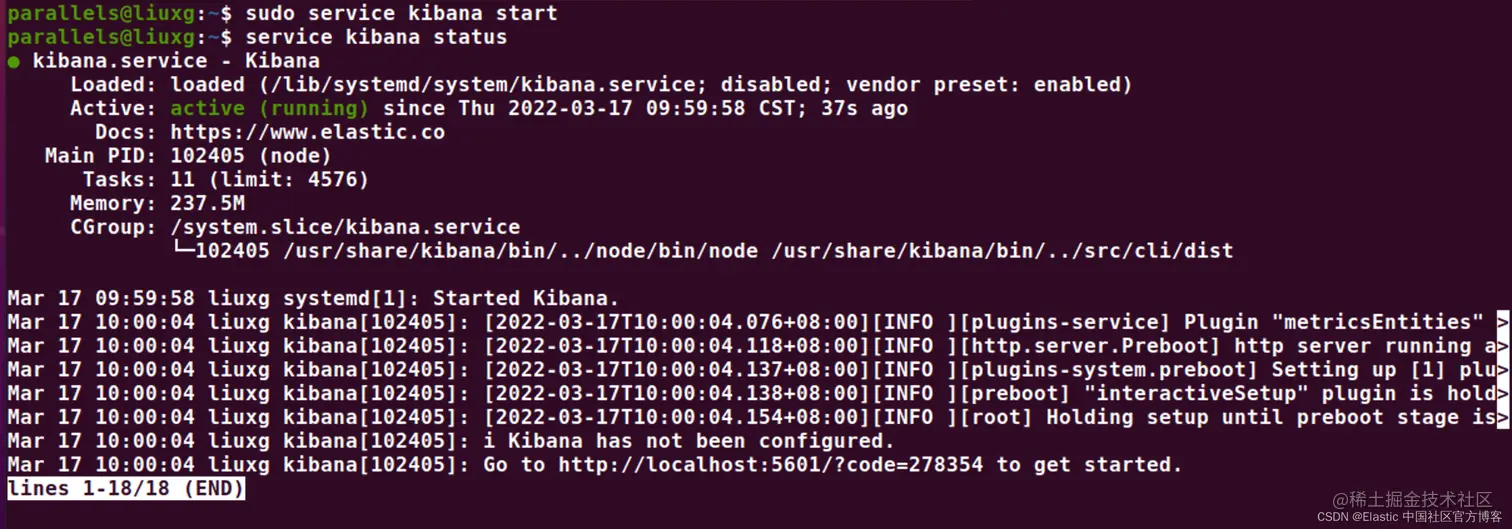 1. parallels@liuxg:~$ service kibana status