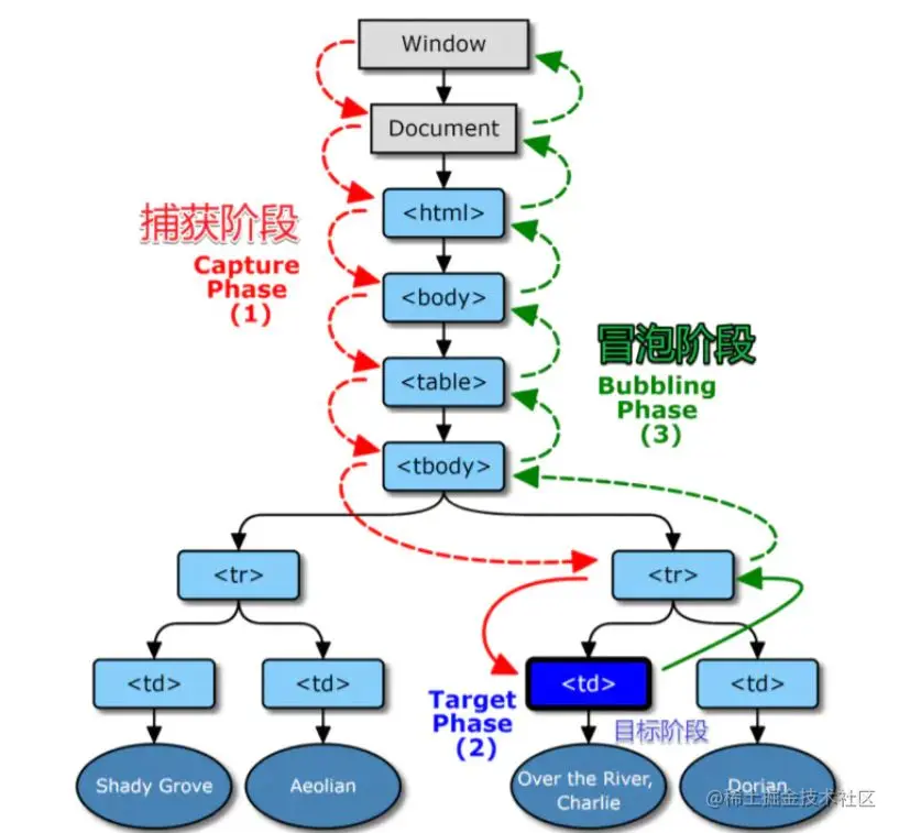 事件捕获(Capture Phase):浏览器从根节点开始由外到内到达目标节点顺序调用监听函数。