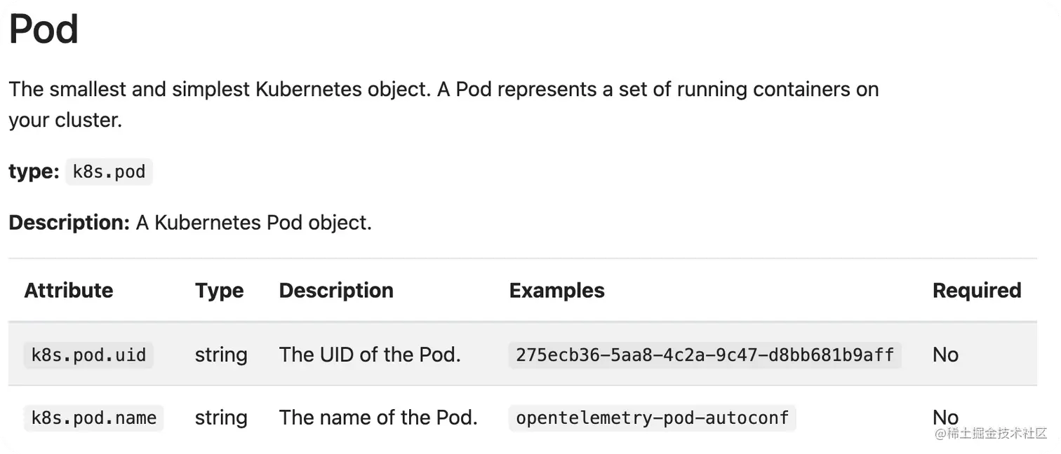 从数据的角度看属性是一个键值对,本质上属性描述了空间信息,方便从空间上做数据关联。OTel定义了很多通用的属性,如果定义不明确或数据不一致时,是没法自动关联分析的。下面是Otel定义的K8S的Pod属性: