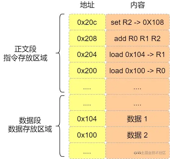 编译器会把 a = 1 + 2 翻译成 4 条指令,存放到正文段中。如图,这 4 条指令被存放到了 0x200 ~ 0x20c 的区域中: