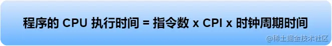 对于 CPU 时钟周期数我们可以进一步拆解成:「指令数 x 每条指令的平均时钟周期数(Cycles Per Instruction,简称 CPI)」,于是程序的 CPU 执行时间的公式可变成如下: