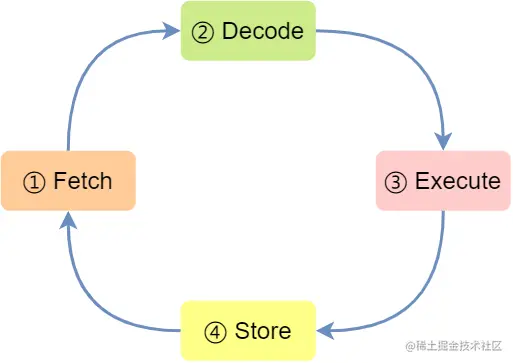 上面这 4 个阶段,我们称为指令周期(Instrution Cycle),CPU 的工作就是一个周期接着一个周期,周而复始。