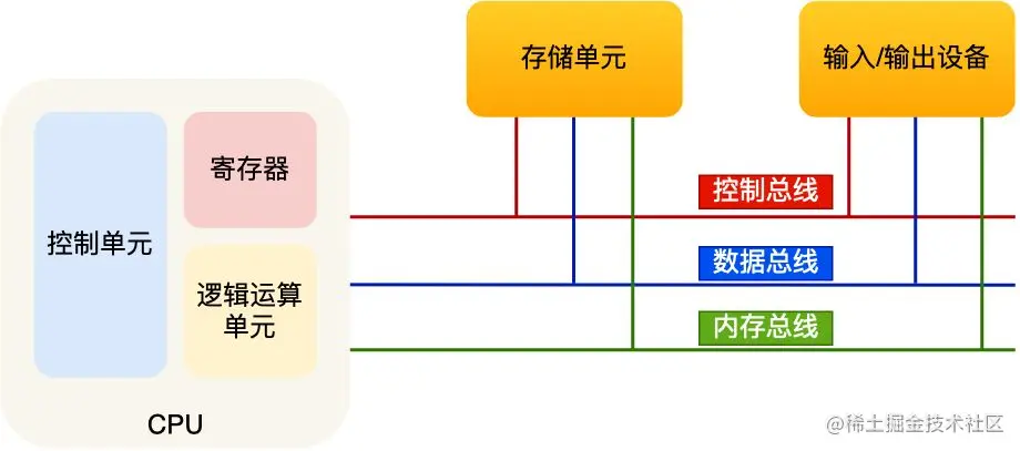 CPU 内部还有一些组件,常见的有寄存器、控制单元和逻辑运算单元等。其中,控制单元负责控制 CPU 工作,逻辑运算单元负责计算,而寄存器可以分为多种类,每种寄存器的功能又不尽相同。
