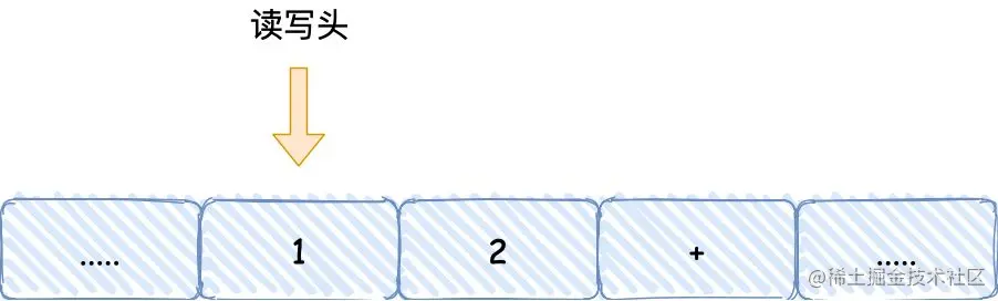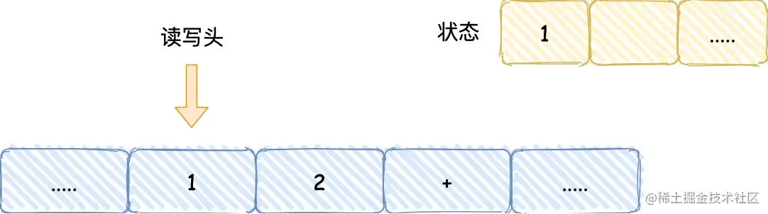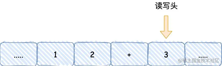 - 首先,用读写头把 「1、2、+」这 3 个字符分别写入到纸带上的 3 个格子,然后读写头先停在 1 字符对应的格子上;