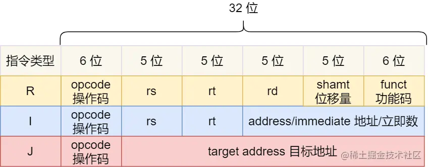 MIPS 的指令是一个 32 位的整数,高 6 位代表着操作码,表示这条指令是一条什么样的指令,剩下的 26 位不同指令类型所表示的内容也就不相同,主要有三种类型R、I 和 J。