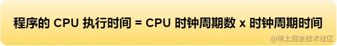 程序执行的时候,耗费的 CPU 时间少就说明程序是快的,对于程序的 CPU 执行时间,我们可以拆解成 CPU 时钟周期数(CPU Cycles)和时钟周期时间(Clock Cycle Time)的乘积。