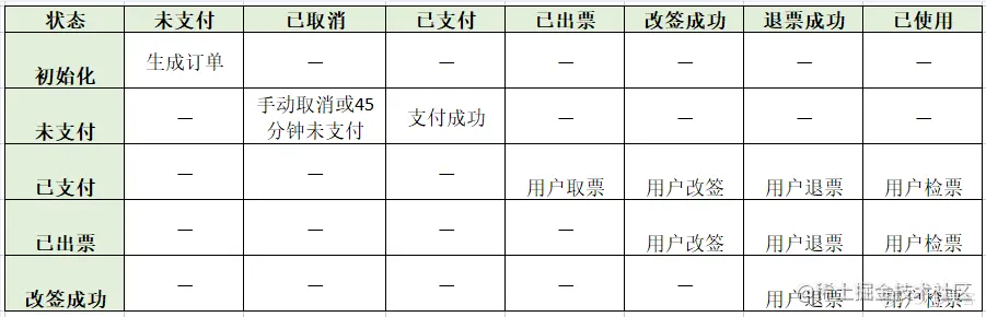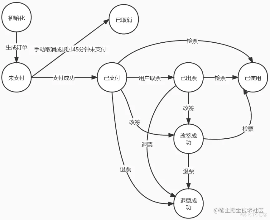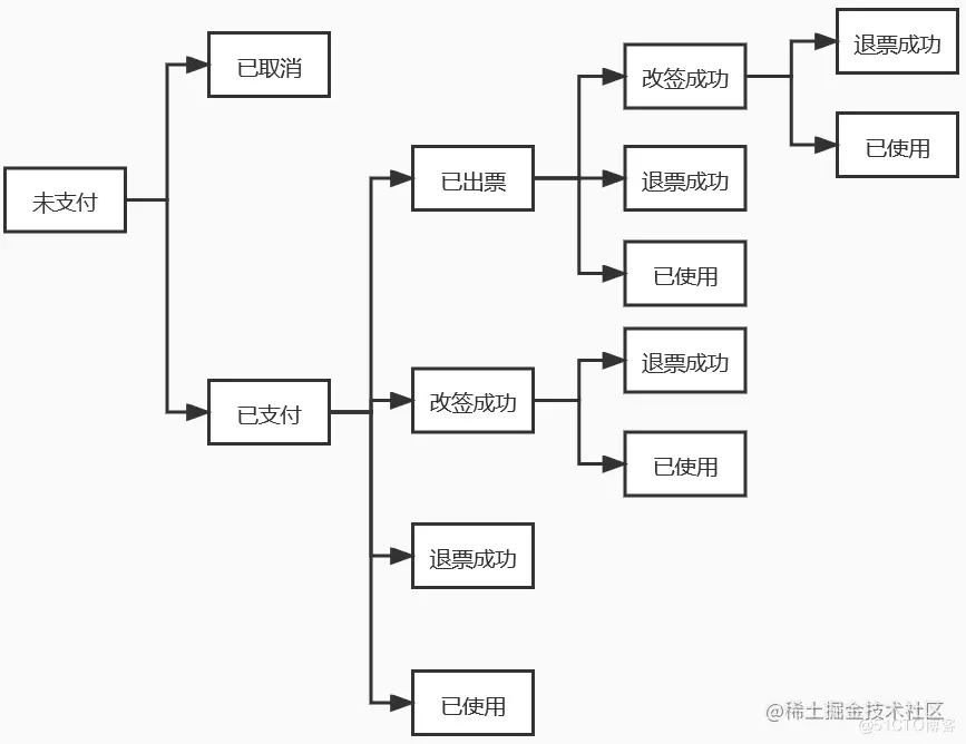 - 未支付--> 已支付--> 改签成功--> 退票成功