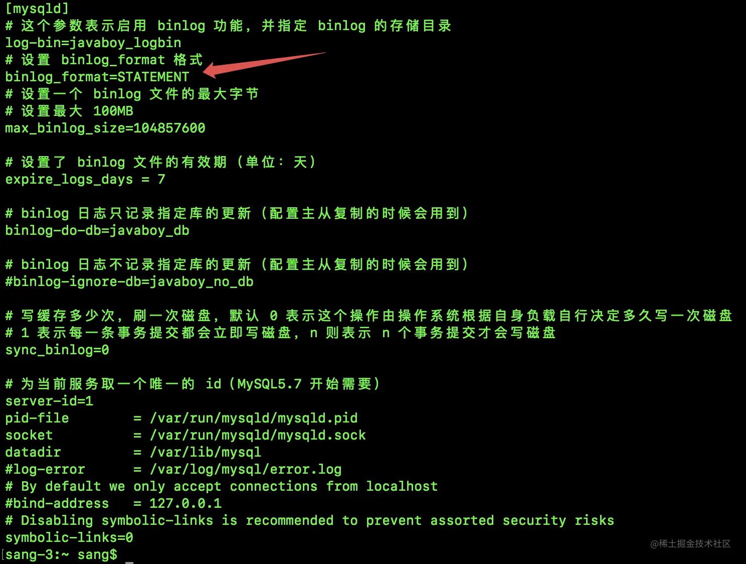 - server-id: MySQL 在主从环境下的唯一标志符,给个任意数字,注意不能和从机重复。
