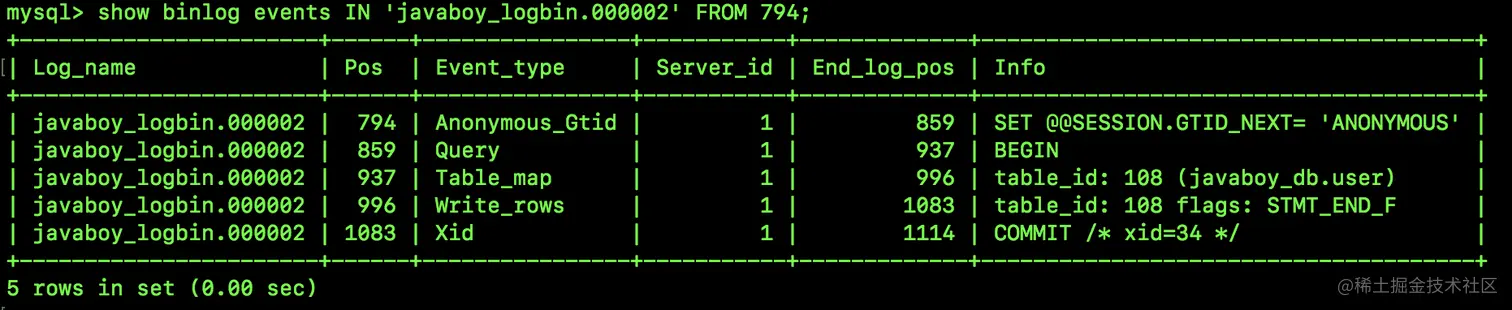 show binlog events IN 'javaboy_logbin.000002' FROM 794;