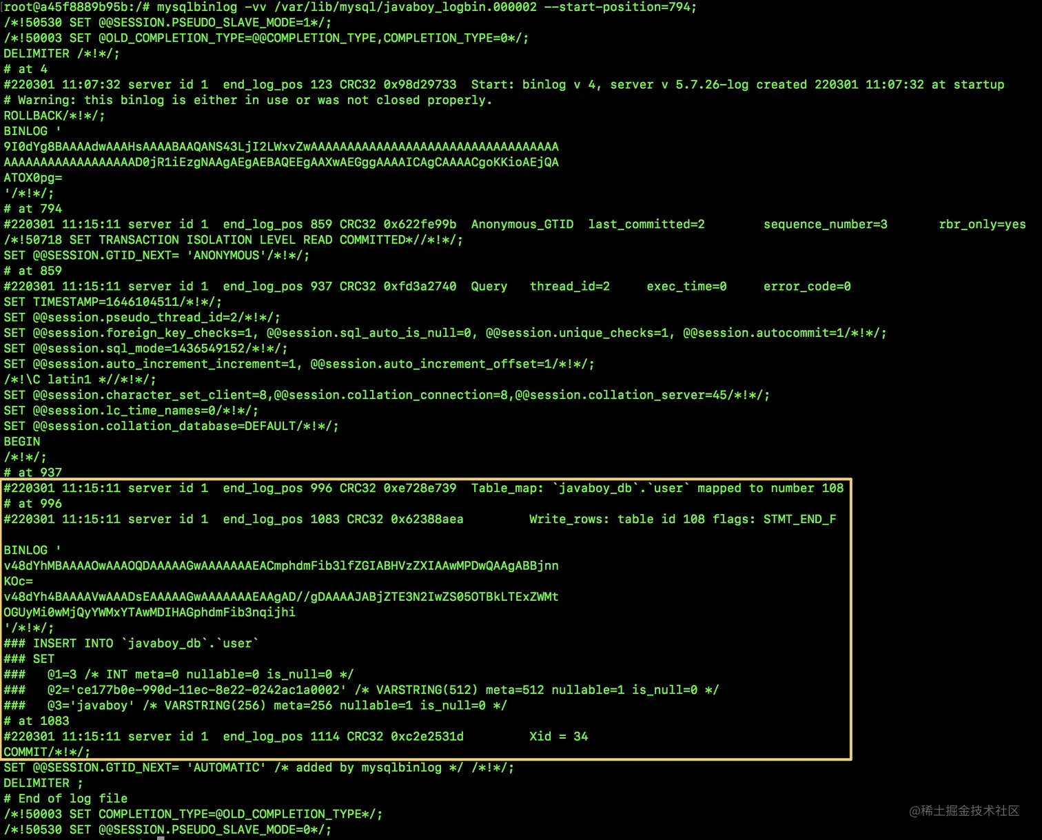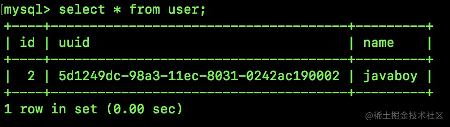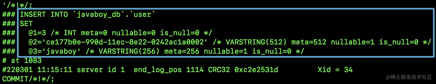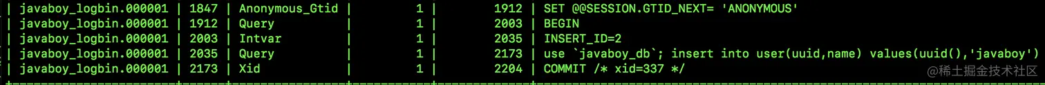 从图中可以看到,记录在 binlog 原文中的日志是:use javaboy_db; insert into user(uuid,name) values(uuid(),'javaboy')。