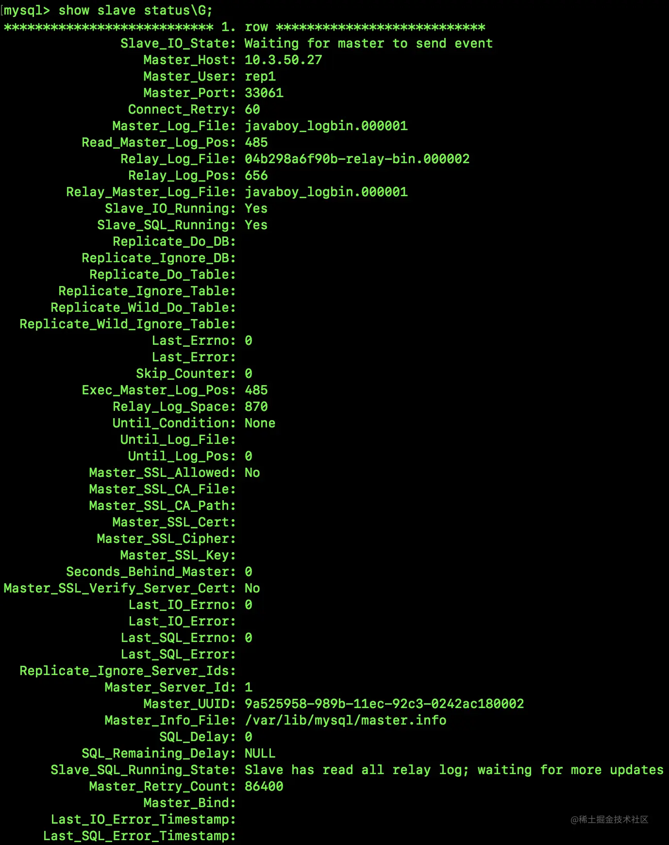 master_log_pos),这个位置包含文件名和日志偏移量。 - 在从机 33061 上执行