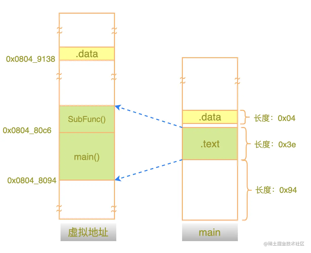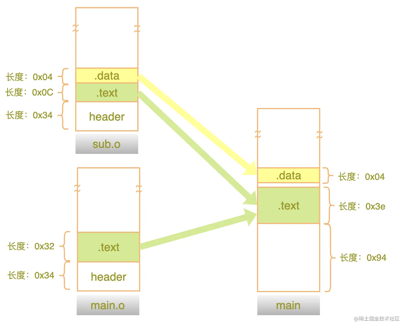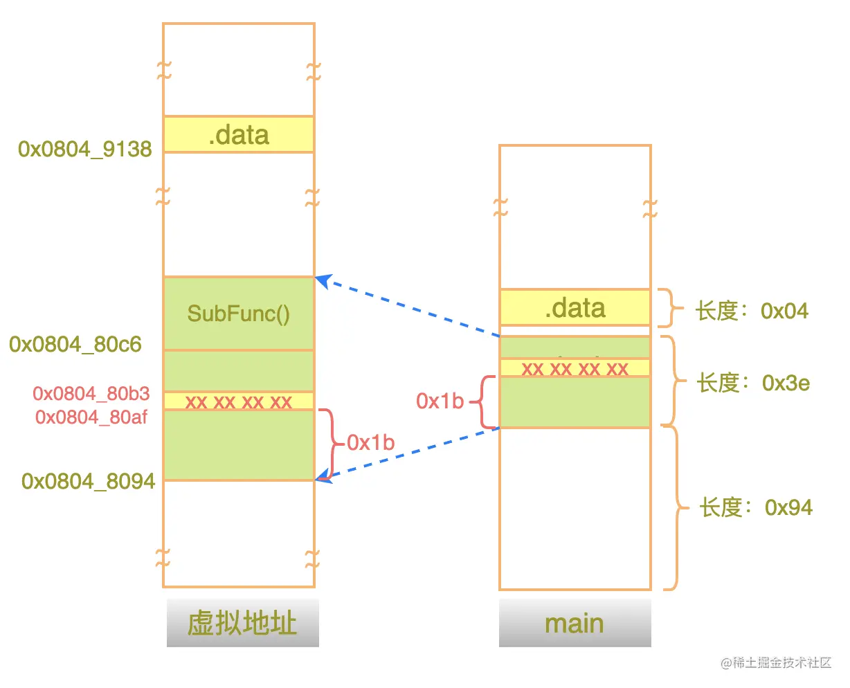 需要计算出在执行文件 main 中的什么位置来填写绝对地址(虚拟地址);