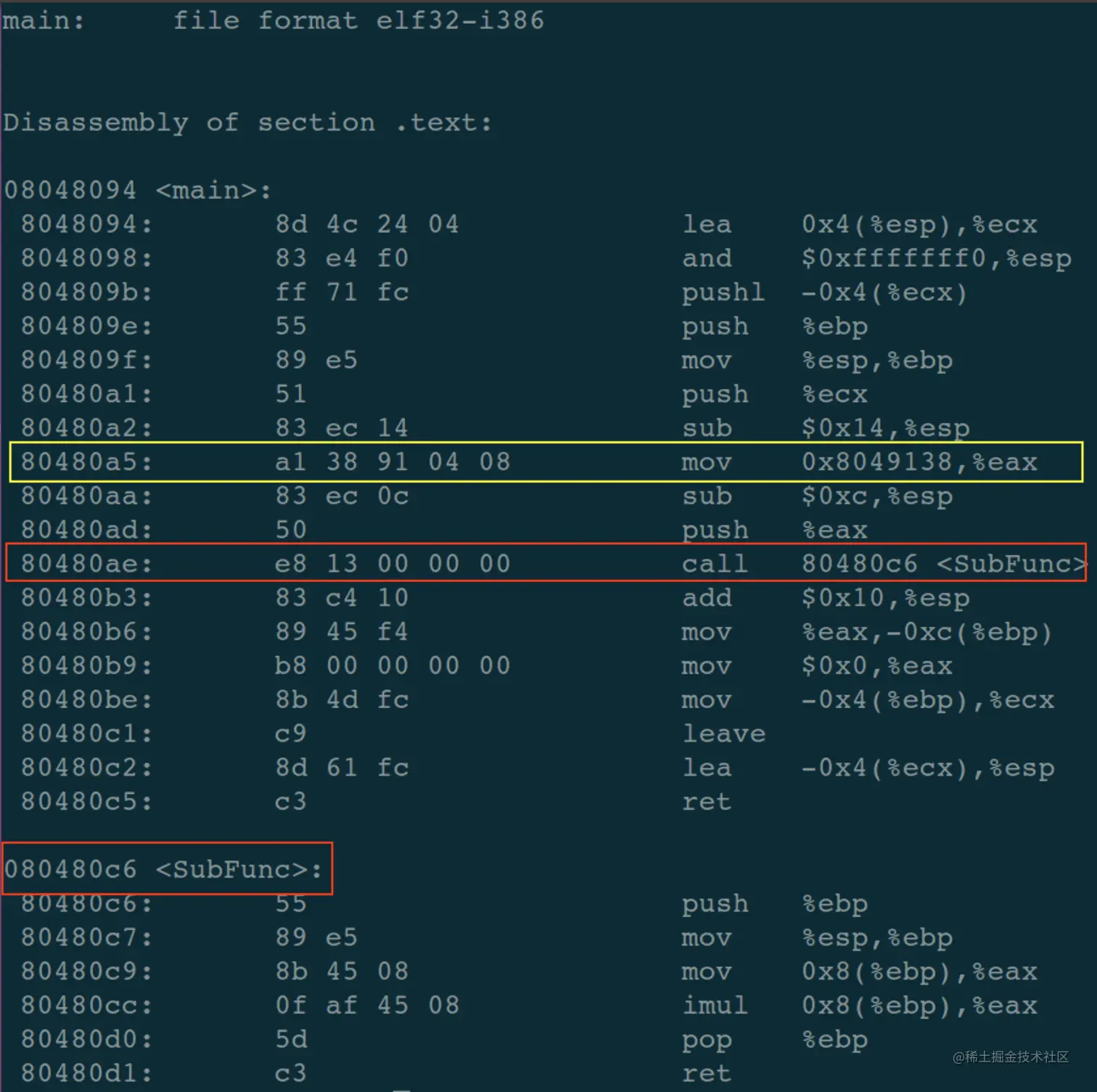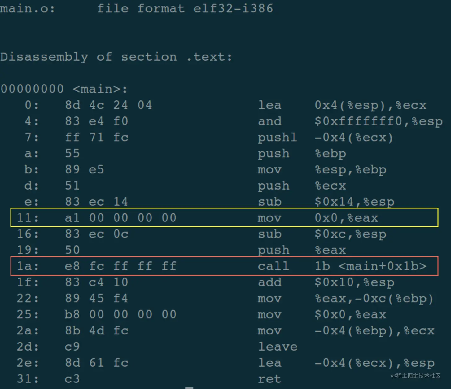 从黄色和红色的矩形框可以看出,二进制指令中的地址值与上面的分析是一致的。