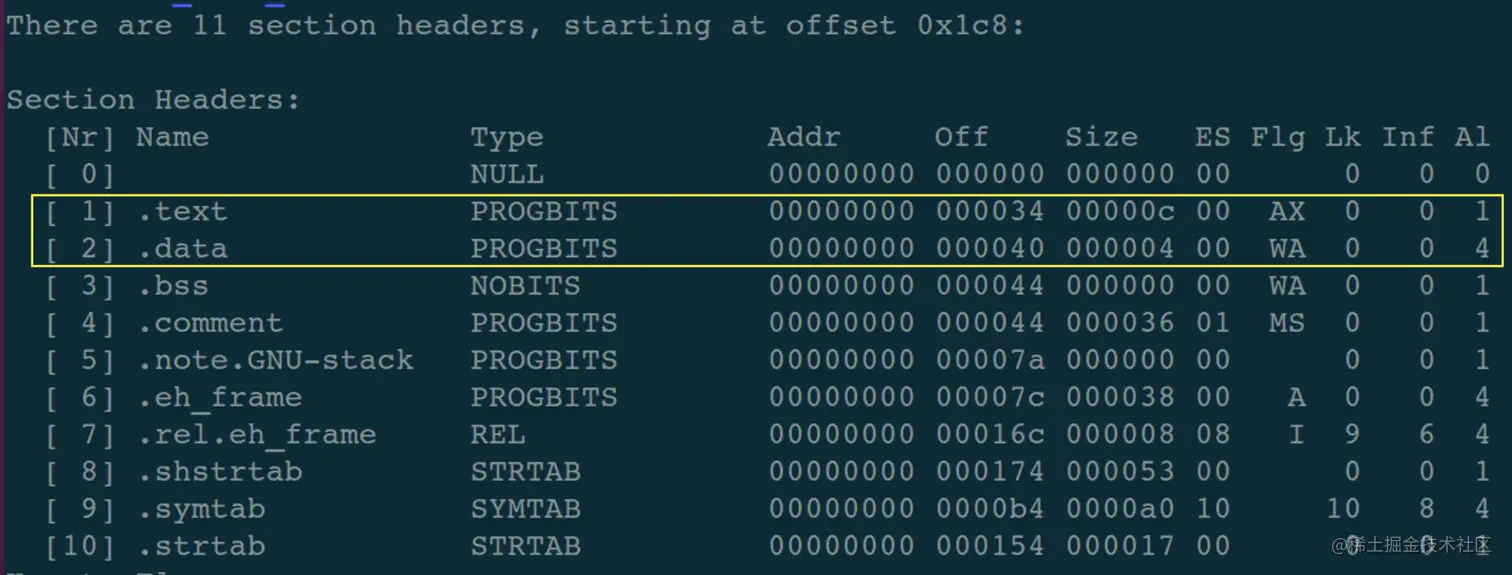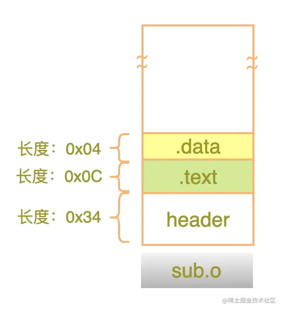 数据段(.data):地址Addr是 0x0000_0000,它在 sub.o 文件中的偏移量(Off)是 0x40,长度是 0x04 字节;