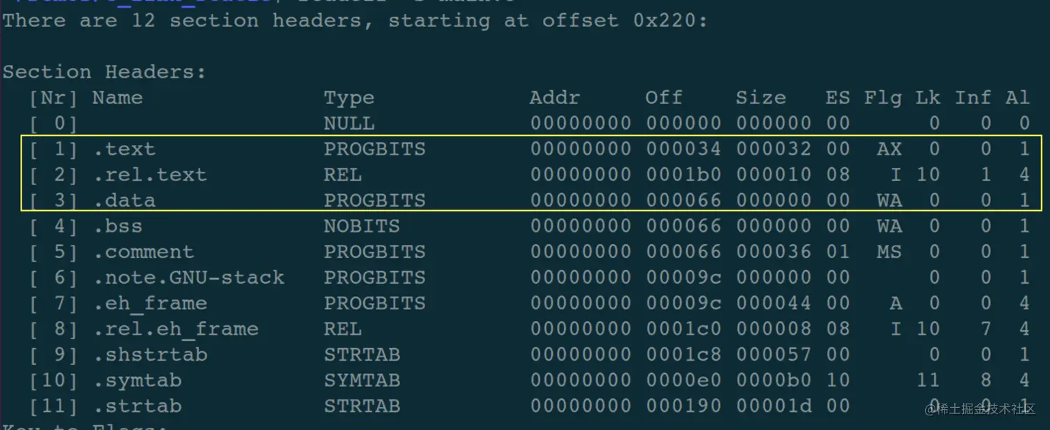 代码段(.text):地址Addr是 0x0000_0000(因为这是目标文件,不是可执行文件,所以不会安排地址),它在 sub.o 文件中的偏移量(Off)是 0x34,长度是 0x0C 字节;