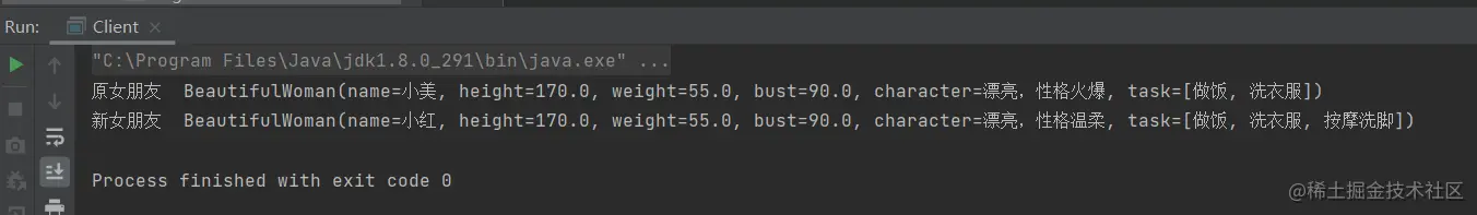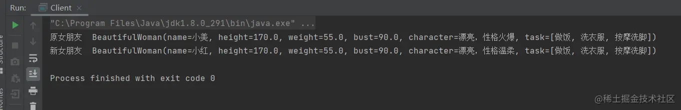 发现,原女友没有按摩洗脚的任务了,小命终于保住了,使用了深克隆后,我们发现她们两个的任务不再一样了,为什么之前使用浅克隆是一样的呢,因为她们的任务是一个引用类型,使用浅克隆时复制的其实不是它们的值,而是它们的地址,使用了深克隆后,它们是以流的形式进行复制。