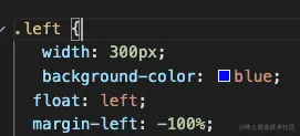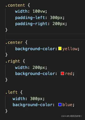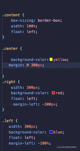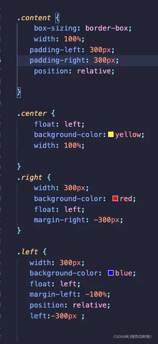 我们给左边盒子一个-margin,注意margin是相对于父亲元素来说的,我的-100%,也就是紧挨着父亲元素的最左边,此时left盒子和center盒子的左边重合。这时候我需要左边盒子再往左移动300px,也就是父亲盒子为它空出去的宽度。