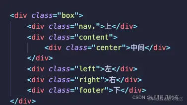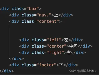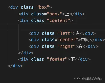 我们要求的大概思路就是,nav和footer占据用户屏幕的百分百宽度,中间内容分为三列,脑子里一定要有一个清晰的网页轮廓。