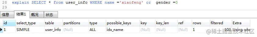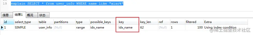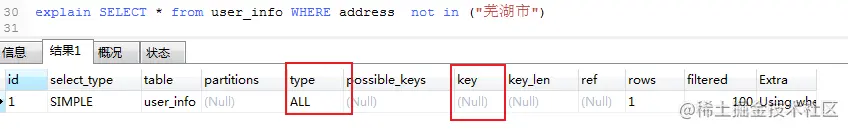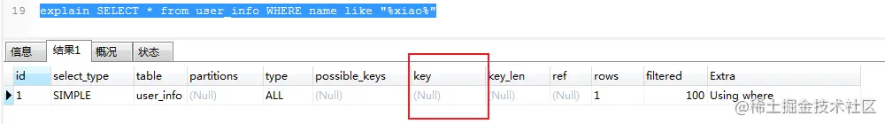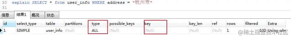 进行SQL数据查询的时候,where条件字段类型与实际表中字段类型不匹配的时候,Mysql会进行隐式的数据类型转换,而类型转换会使用到内置函数,导致在进行数据查询的时候并没有使用索引。我们可以使用explain命令查看sql语句。可以看的出来在key栏中,对应的值为null,说明并没有使用索引进行查询。