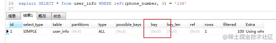 但是如果在按照phone_number字段为字符串类型进行查询的时候,Mysql没有进行隐式的类型转换,所以最终还是走了索引。