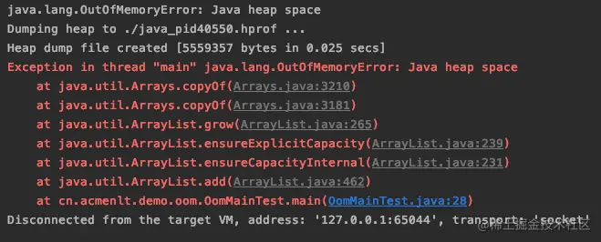 通过报错信息得知,java heap space 表示 OOM 发生在堆区,并生成了 hprof 二进制文件在当前文件夹下