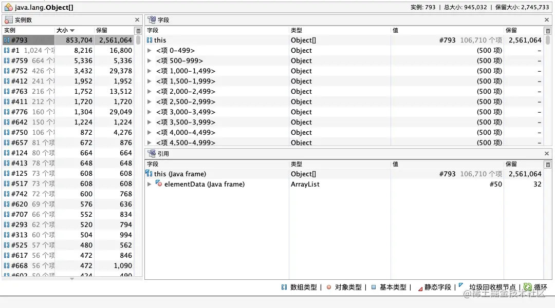 其中 "[" 代表数组,例如 "[C" 代表 Char 数组,"[B" 代表 Byte 数组。如果数组内存占用过多,我们不知道哪些对象持有它,所以就需要 Dump 内存进行离线分析