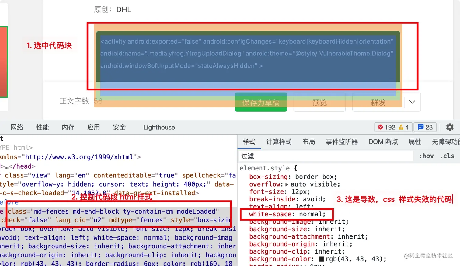正如图中 3 标记的地方,当我们从 Typora 拷贝文章的时候,会自动添加 white-space: normal; 样式,覆盖掉了我们添加的样式 white-space: nowrap; ,我们可以尝试在浏览器调试台去掉这个样式,动画效果如下所示。